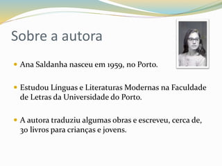 Ana Saldanha nasceu no Porto em 1959 e estudou literatura moderna. Ela escreveu cerca de 30 livros para crianças e jovens e recebeu vários prêmios literários, incluindo o Prêmio Adolfo Simões Muller por Três Semanas com a Avó. Vários de seus livros fazem parte do Plano Nacional de Leitura português.