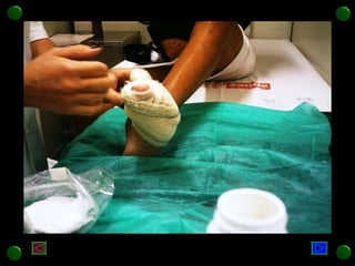 O documento discute o pé diabético, suas causas, sintomas e formas de prevenção. O diabetes pode danificar os nervos e vasos sanguíneos dos pés, levando a feridas e infecções. Manter os pés limpos e hidratados, examiná-los diariamente e usar calçados confortáveis pode ajudar a prevenir complicações. A equipe de enfermagem desempenha um papel importante na educação dos pacientes diabéticos sobre o cuidado adequado com os pés.