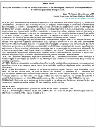 Este documento apresenta 5 trabalhos acadêmicos sobre gestão em enfermagem. O primeiro relata a experiência de transmitir informações aos familiares de pacientes no centro cirúrgico. O segundo discute a importância do enfermeiro na gestão administrativa e hotelaria hospitalar. O terceiro analisa a flebite como indicador de qualidade assistencial. O quarto descreve a implantação de kits cirúrgicos para redução de custos. E o quinto trata da percepção da equipe de enfermagem.