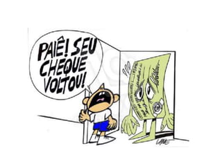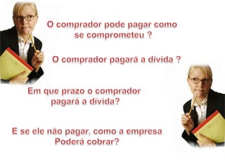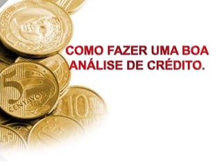 O documento discute os conceitos e análise de crédito, incluindo os 5 Cs do crédito (Caráter, Capacidade, Capital, Condições e Colateral), a importância do cadastro do cliente, a atribuição de limites e pontuação de crédito, e a classificação do risco do cliente.