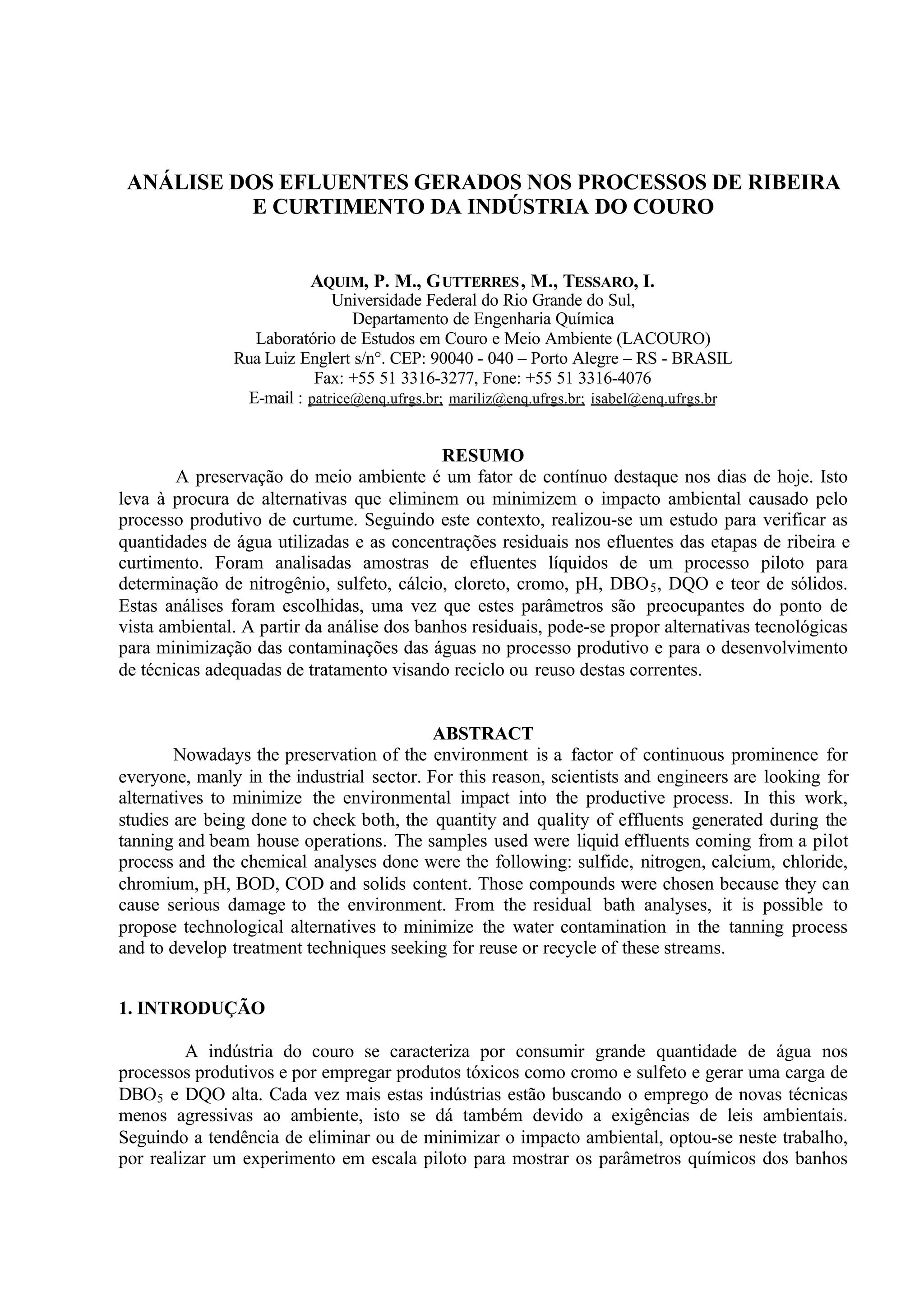 O documento analisa efluentes gerados nos processos de ribeira e curtimento da indústria do couro, abordando a elevada quantidade de água e substâncias tóxicas utilizadas. O estudo propõe alternativas tecnológicas para minimizar a contaminação da água e desenvolver técnicas de tratamento para reciclo e reuso. Análises químicas de efluentes identificaram altos níveis de poluentes, destacando a necessidade de melhorias nas práticas industriais.