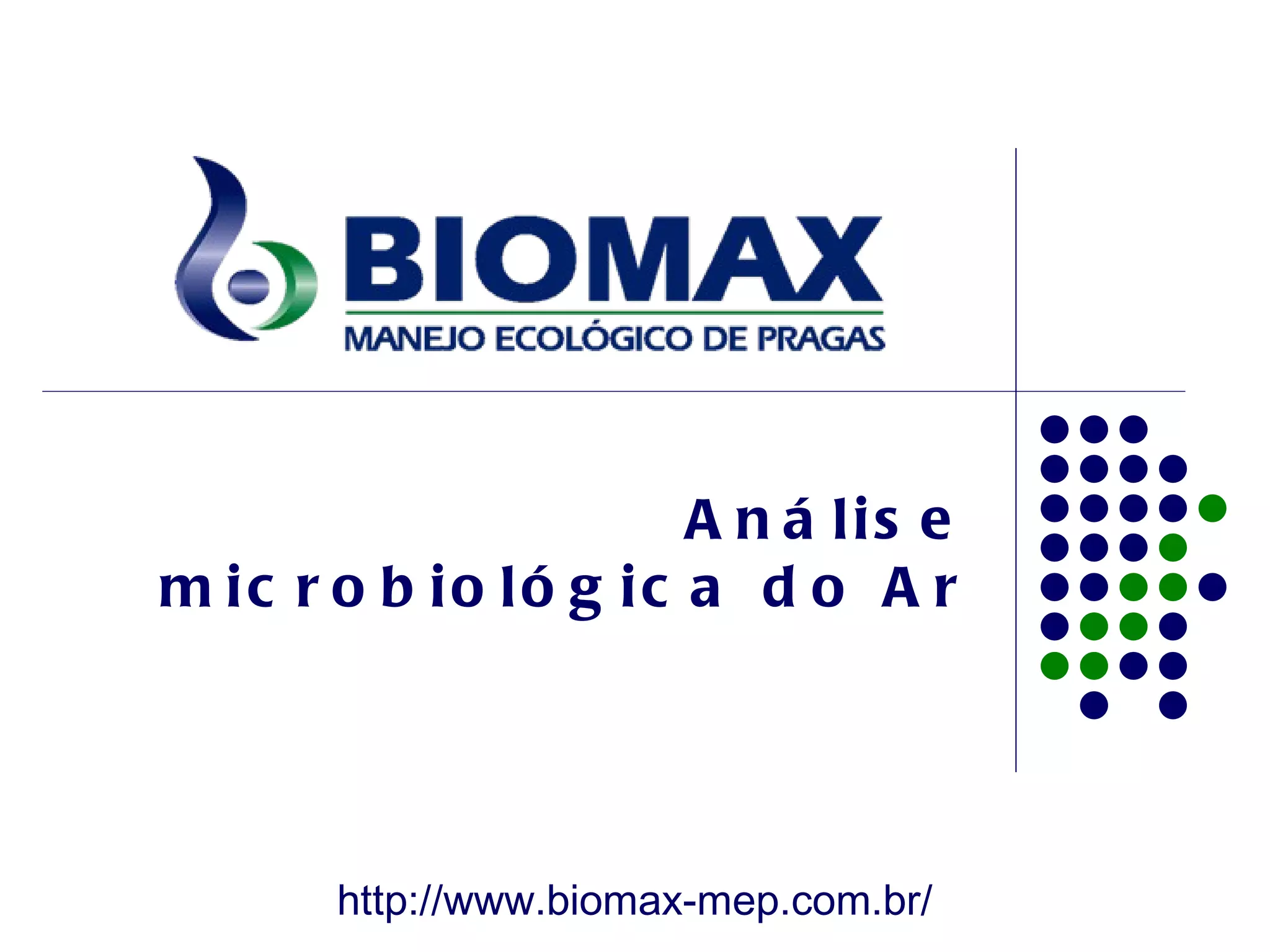 O documento aborda a análise microbiológica do ar em ambientes climatizados, destacando a importância da avaliação da qualidade do ar e da poluição, especialmente em relação à síndrome do edifício doente. São detalhados métodos de coleta e análise de contaminantes microbiológicos e químicos, bem como histórico e regulamentações pertinentes à saúde ocupacional. A Biomax é apresentada como uma empresa especializada nesse tipo de análise, atendendo diversos setores como saúde e hotelaria.