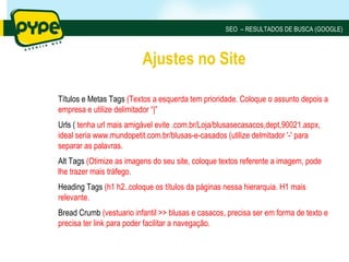 O documento fornece recomendações para melhorar o desempenho do site mundopetit.com.br nos resultados de busca do Google, incluindo: (1) otimizar títulos, metatags e URLs; (2) adicionar texto alternativo às imagens; (3) usar corretamente tags H1-H6; (4) incluir breadcrumbs; (5) melhorar a qualidade e padronização do layout e design.