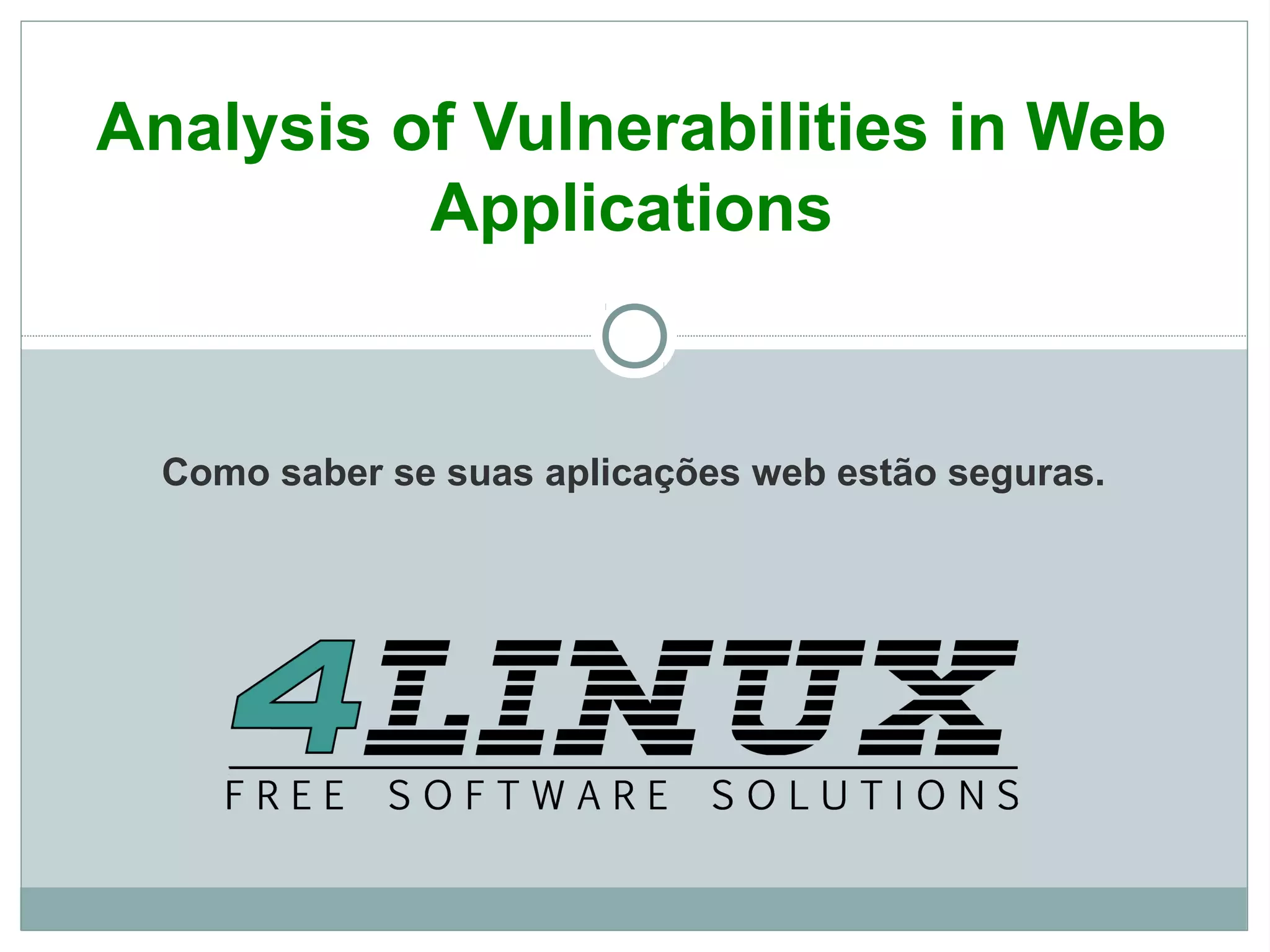 O documento discute análise de vulnerabilidades em aplicações web, abordando princípios de sistemas web, ataques web, princípios de segurança web, OWASP, ferramentas de análise e auditoria, vulnerabilidades web e oportunidades. O documento também apresenta uma demonstração da ferramenta WebGoat para ensinar sobre segurança em aplicações web.