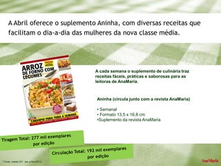 O documento apresenta um suplemento de culinária chamado Aninha, publicado junto com a revista AnaMaria. Ele traz receitas semanais fáceis e práticas para as leitoras. São detalhados os valores e especificações para o patrocínio do suplemento em duas edições, incluindo páginas customizadas e uma publieditorial em cada edição. Algumas observações sobre prazos, disponibilidade e acesso ao conteúdo editorial também são feitas.