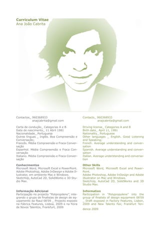Ana João Cabrita é uma designer de produtos portuguesa com uma formação diversificada em design, incluindo um diploma em design de equipamento pela Faculdade de Belas Artes da Universidade de Lisboa. Seu portfólio inclui diversos projetos inovadores que utilizam materiais reciclados e conceitos de design funcional, além de experiências profissionais como lojista e motorista. Possui habilidades em ferramentas de design como SolidWorks, AutoCAD e Adobe Creative Suite, além de fluência em várias línguas.
