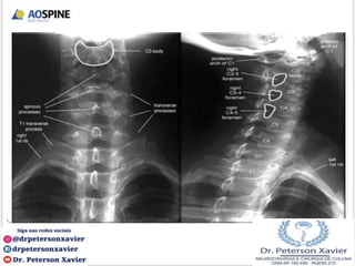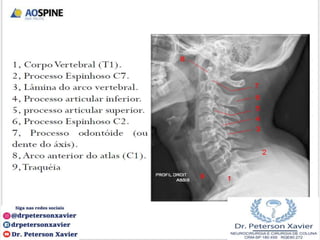 O documento discute a anatomia da coluna cervical, descrevendo as características das vértebras cervicais C1-C7 e suas articulações. Inclui detalhes sobre a anatomia do atlas (C1), do eixo (C2) e das vértebras subaxiais C3-C7, assim como suas aplicações clínicas relevantes.