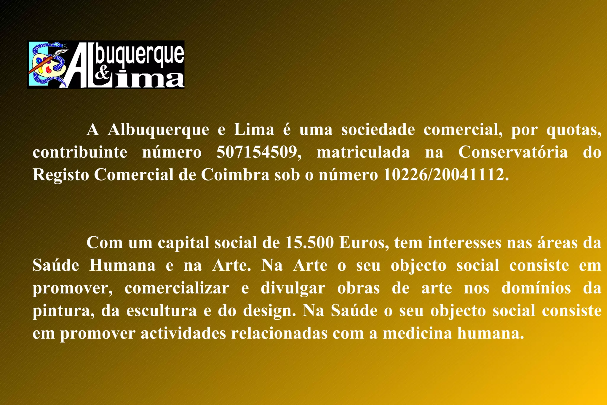 A Albuquerque e Lima é uma sociedade comercial que atua nas áreas da saúde e arte. Na saúde, oferece serviços de ortopedia, perícia médica e avaliação de danos corporais. Na arte, promove exposições e workshops. A empresa também realiza conferências sobre anatomia para artistas.