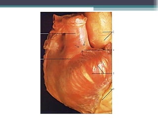 O documento apresenta a anatomia do coração, descrevendo sua localização e estrutura interna, incluindo câmaras, sistemas de condução elétrica e vascularização. O coração é descrito como um órgão muscular localizado na região mediastinal central do tórax. Sua estrutura interna inclui átrios e ventrículos separados por válvulas, e um sistema de condução elétrica iniciado no nó sinoatrial. O coração recebe irrigação sanguínea das artérias coronárias.