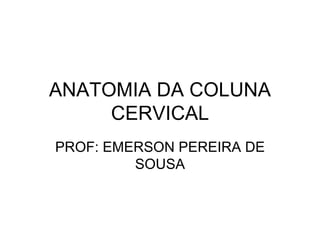 O documento descreve as características anatômicas da coluna cervical, incluindo que as vértebras C3 a C7 possuem forames transversários e processo espinhoso bífido, e que C7 se destaca por seu processo espinhoso mais proeminente. Também menciona particularidades entre C1 e C2 e alguns músculos do pescoço.