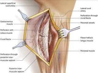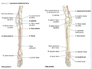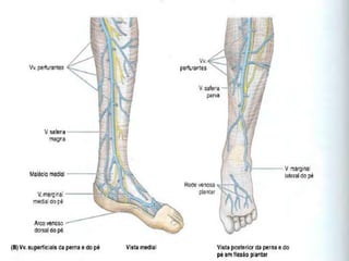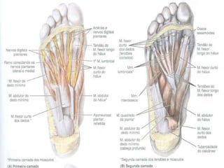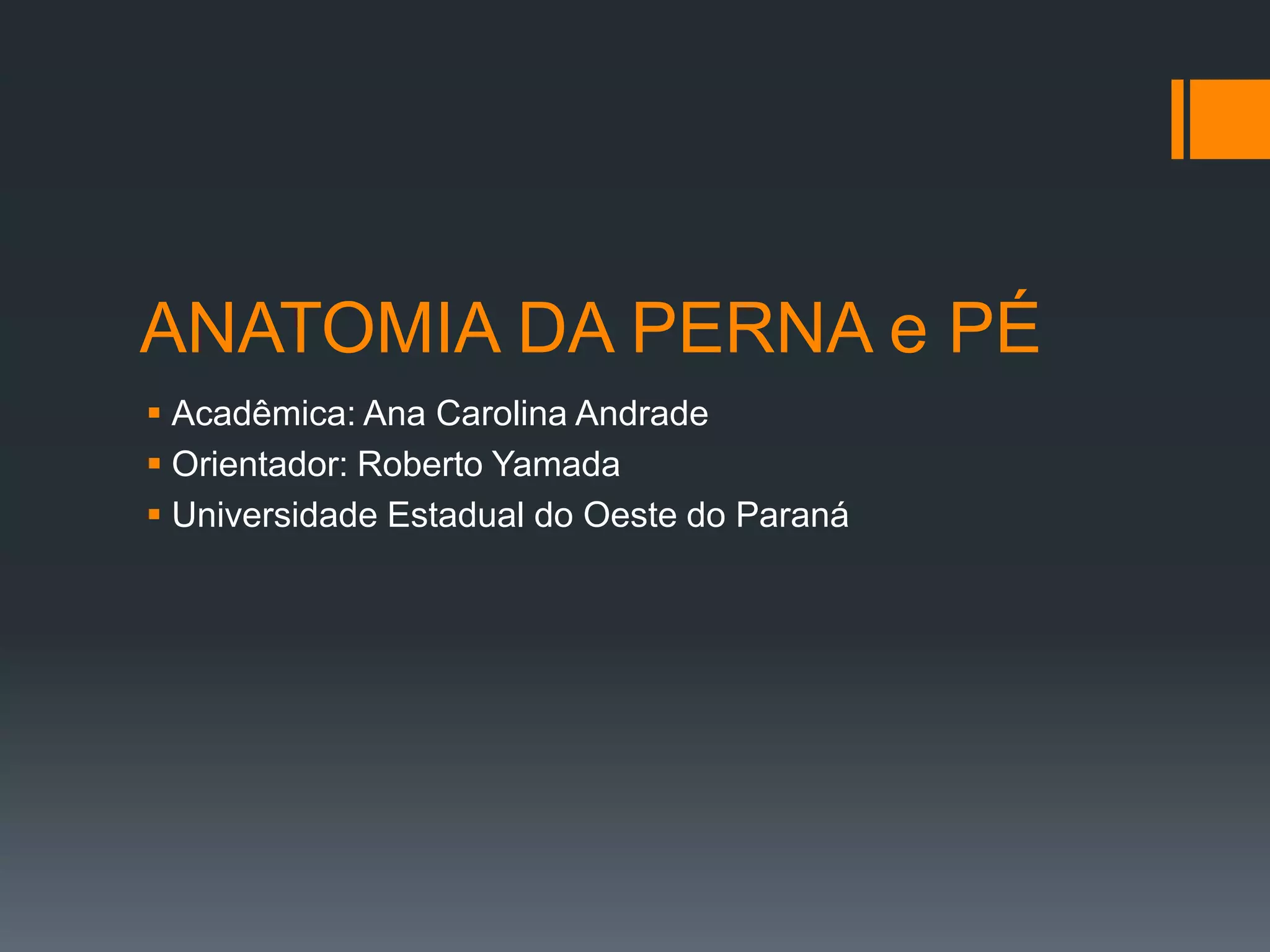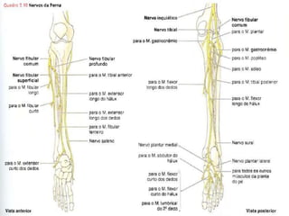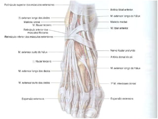 Este documento resume a anatomia da perna e do pé, descrevendo os principais ossos, músculos, nervos e vasos de cada região. A perna é dividida em três compartimentos - anterior, lateral e posterior - cada um contendo músculos específicos. O documento também detalha a anatomia do pé, incluindo ossos, músculos, nervos e vasos.