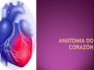 O documento descreve a anatomia do coração humano. Ele localiza o coração no peito e descreve sua forma piramidal inclinada. Detalha as principais estruturas do coração, incluindo cavidades, vasos sanguíneos e válvulas. Também explica as camadas do miocárdio, endocárdio e epicárdio, assim como o pericárdio envolvendo o coração.