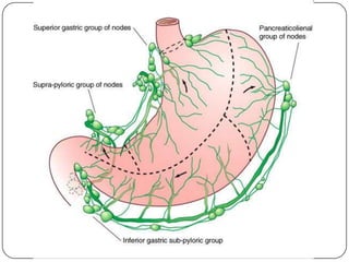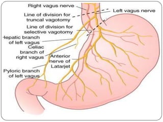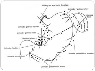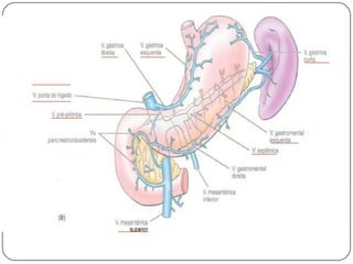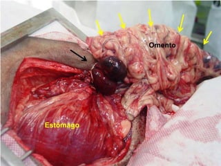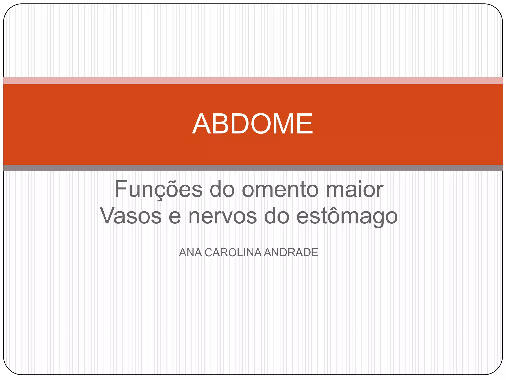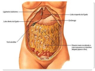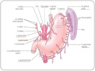 O documento descreve as funções e estruturas do omento maior, vasos e nervos do estômago. O omento maior protege os órgãos abdominais e impede aderências. As artérias e veias gástricas irrigam e drenam o estômago. Os nervos vago e simpático controlam a secreção gástrica e peristaltismo. Vagotomia pode reduzir produção de ácido em úlceras pelo controle vagal.