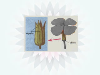 Sépalas- pequenas peças florais geralmente de cor verde, têm a função de proteger a flor. O seu conjunto forma o cálice .