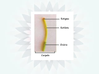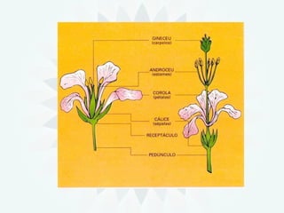 O documento descreve a anatomia da folha e da flor. Detalha que as folhas têm duas epidermes e um mesófilo no meio, e que as flores têm órgãos de suporte, proteção e reprodução, incluindo sépalas, pétalas, estames e carpelos.