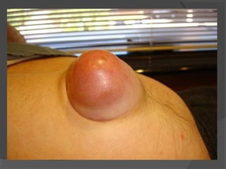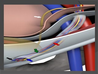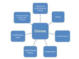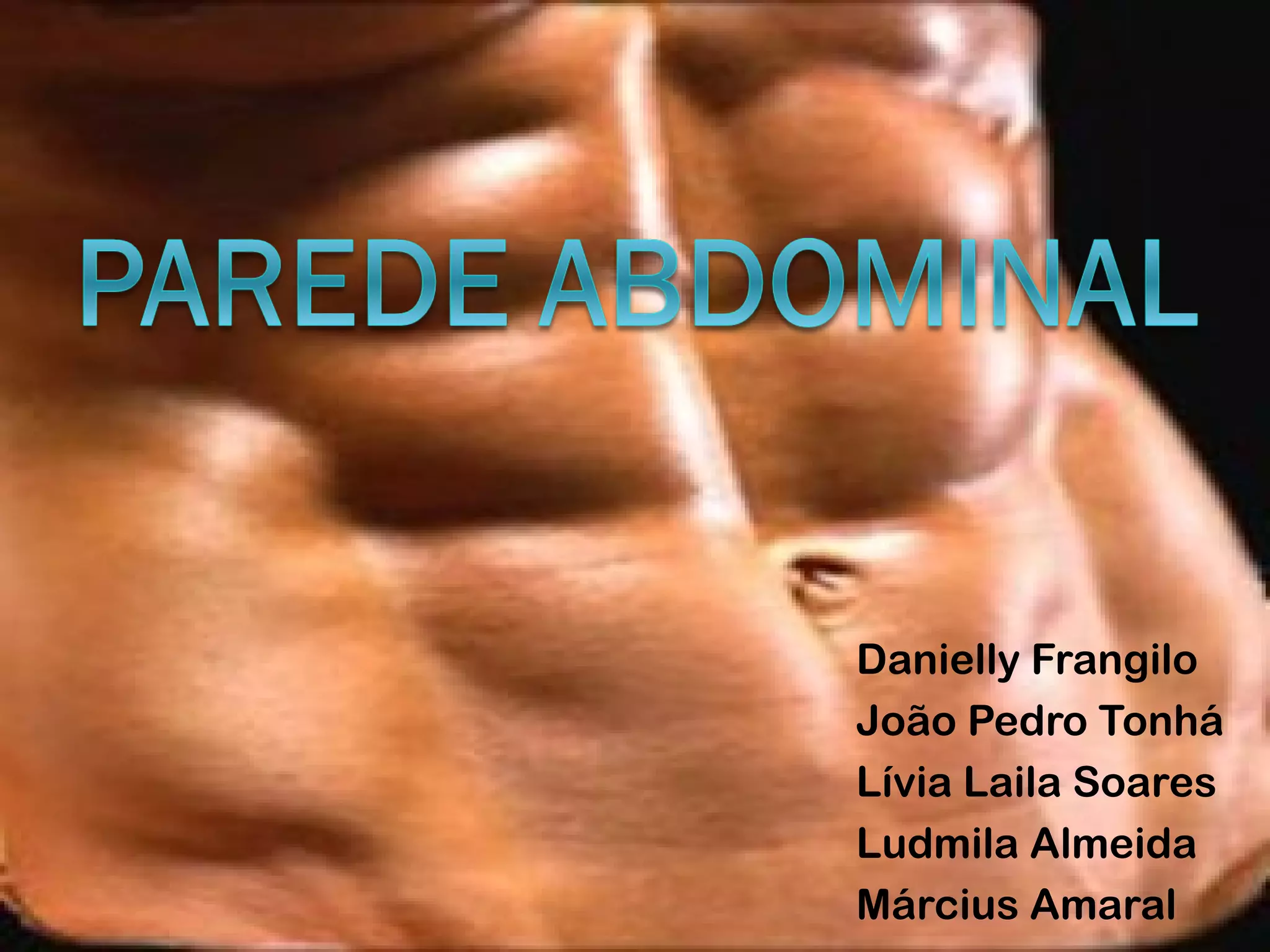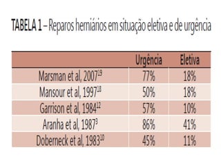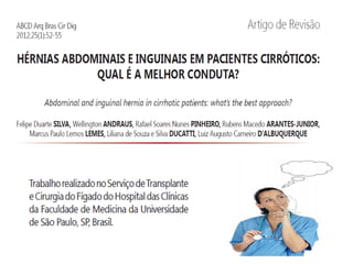 O documento discute a anatomia da parede abdominal, regiões abdominais, músculos da parede abdominal, hérnias e seu tratamento. Aborda especificamente fatores de risco para hérnias em pacientes cirróticos e a tendência de realizar operações eletivas nestes pacientes.