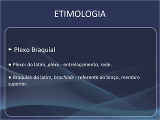 Este documento apresenta os principais pontos sobre o plexo braquial, incluindo sua etimologia, estrutura, ramos colaterais e terminais. É descrito o trajeto e função de nervos como o musculocutâneo, axilar, radial, mediano e ulnar. São apresentadas lesões típicas de cada nervo e variações anatômicas do plexo.