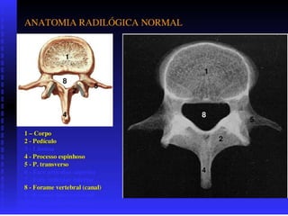 1. O documento apresenta instruções sobre posicionamento e critérios para realização de radiografias de crânio, coluna cervical, coluna torácica e coluna lombar.