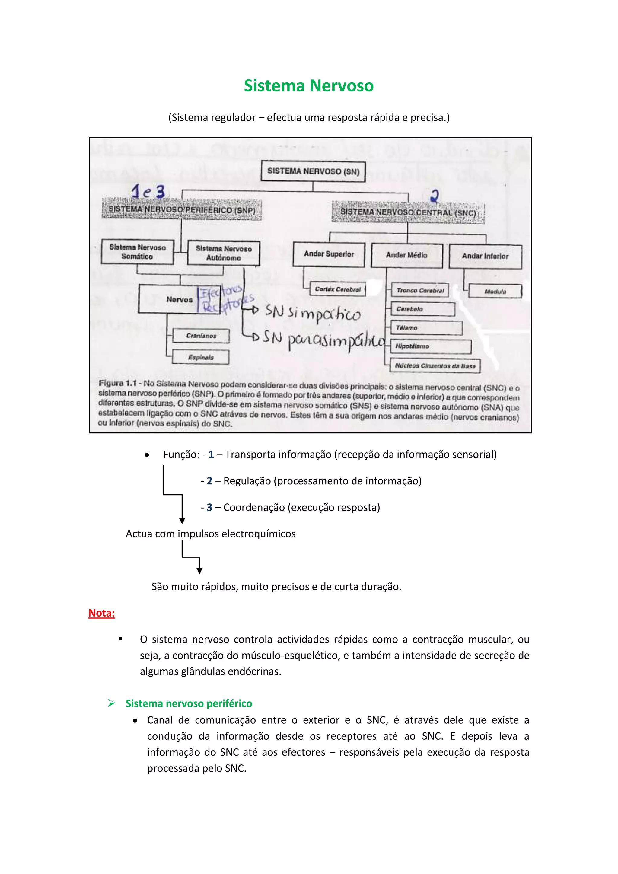 O documento descreve o sistema nervoso humano e seus componentes. Resume que o sistema nervoso é responsável por (1) receber informações sensoriais, (2) processar essas informações e (3) produzir respostas. Descreve também que os neurônios transmitem impulsos elétricos de forma rápida e precisa para coordenar funções como a contração muscular.