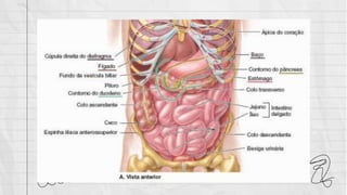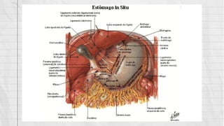 O documento descreve a anatomia dos órgãos supramesocólicos, incluindo sua localização, vascularização e relações. É apresentada uma descrição detalhada do estômago, pâncreas, duodeno, fígado, baço e suas principais características anatômicas.