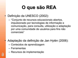 O documento discute recursos educacionais abertos (REA), definindo-os como recursos educacionais gratuitos compartilhados sob licenças abertas. Ele fornece exemplos de projetos REA na Universidade Fernando Pessoa, como um arquivo digital sobre literatura experimental portuguesa e um arquivo sobre José de Almada Negreiros. Finalmente, lista outros projetos e estudos REA notáveis.