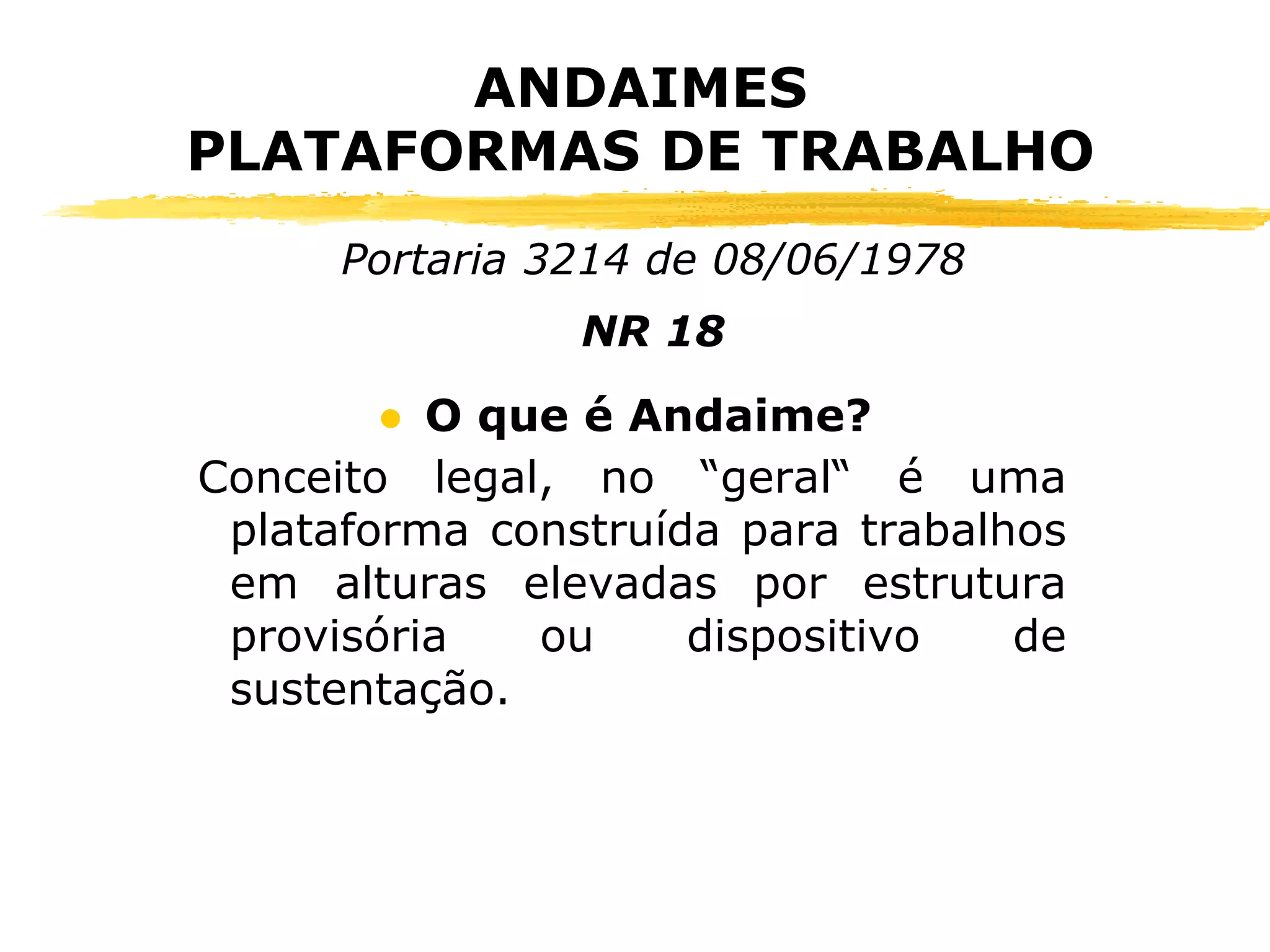 O documento discute andaimes e plataformas de trabalho, definindo andaimes como plataformas construídas para trabalhos em alturas elevadas. Detalha os tipos de andaimes, equipamentos, normas regulamentadoras e padrões de montagem para garantir a segurança dos trabalhadores.