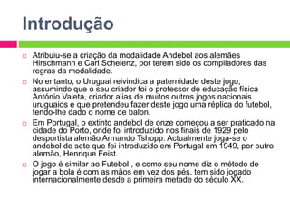 O documento resume as principais regras e estratégias do handebol. Começa explicando a origem do esporte na Alemanha no século XIX e como se espalhou para outros países como Portugal e Uruguai. Detalha os requisitos físicos dos jogadores, o campo de jogo, duração das partidas, equipamentos e regras básicas como faltas, gols e substituições. Também descreve estratégias defensivas como o sistema 6x0 e ofensivas para furar essa defesa.