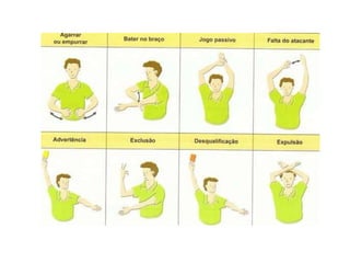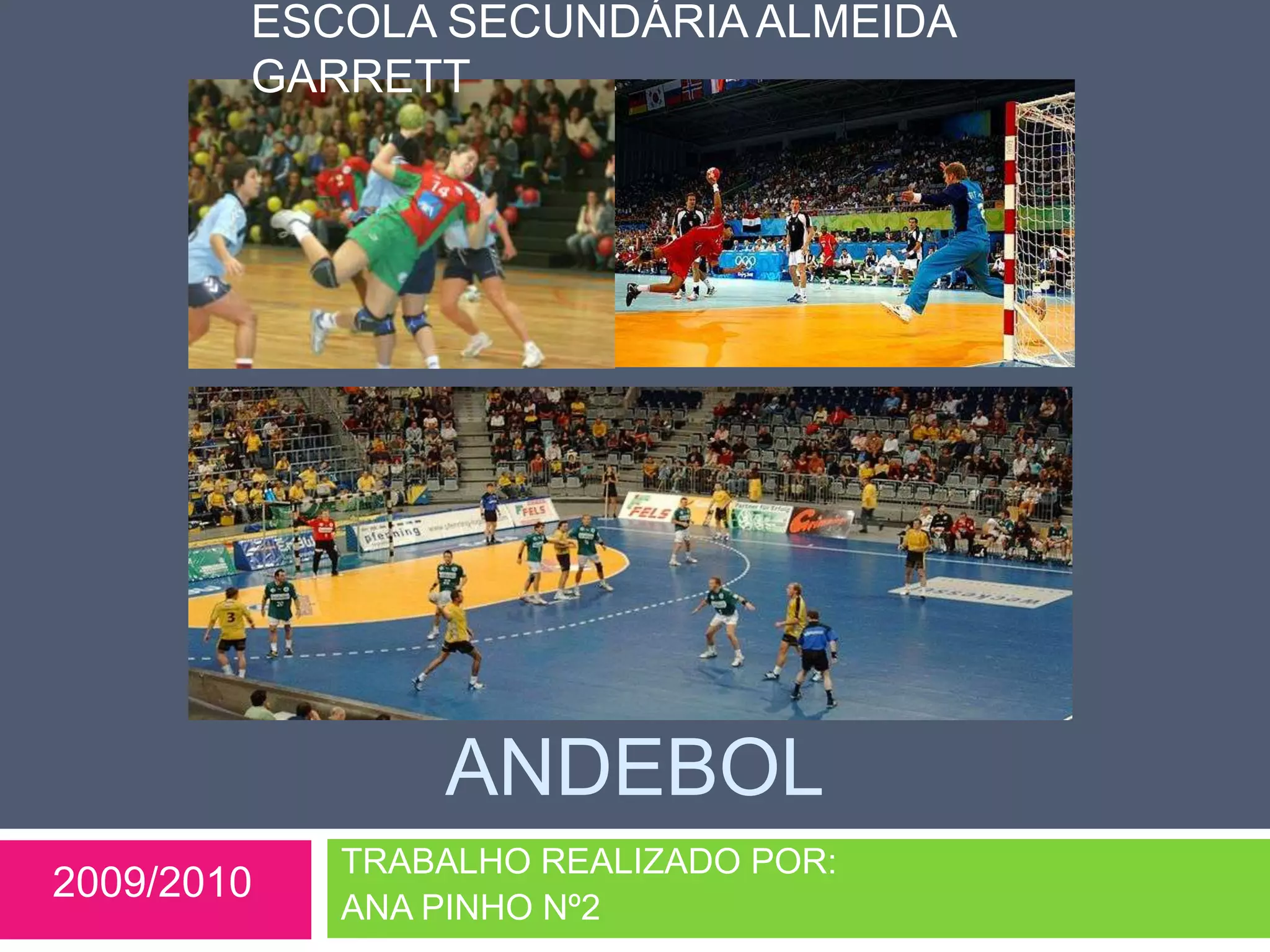 O documento resume as principais regras e estratégias do handebol. O handebol surgiu na Alemanha no início do século XX e é jogado por duas equipes de sete jogadores cada. O objetivo é marcar gols lançando a bola na baliza adversária apenas usando as mãos. As equipes usam diferentes táticas defensivas como o sistema 6x0 para dificultar o avanço dos atacantes.