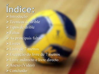 Este documento resume as técnicas fundamentais do handebol, incluindo dribles, faltas, e lances livres. Detalha os tipos de dribles, as principais infrações, e explica os lances livres de 7 metros e a diferença entre lances livres diretos e indiretos. O objetivo é demonstrar esses conceitos chave do handebol para outros colegas.