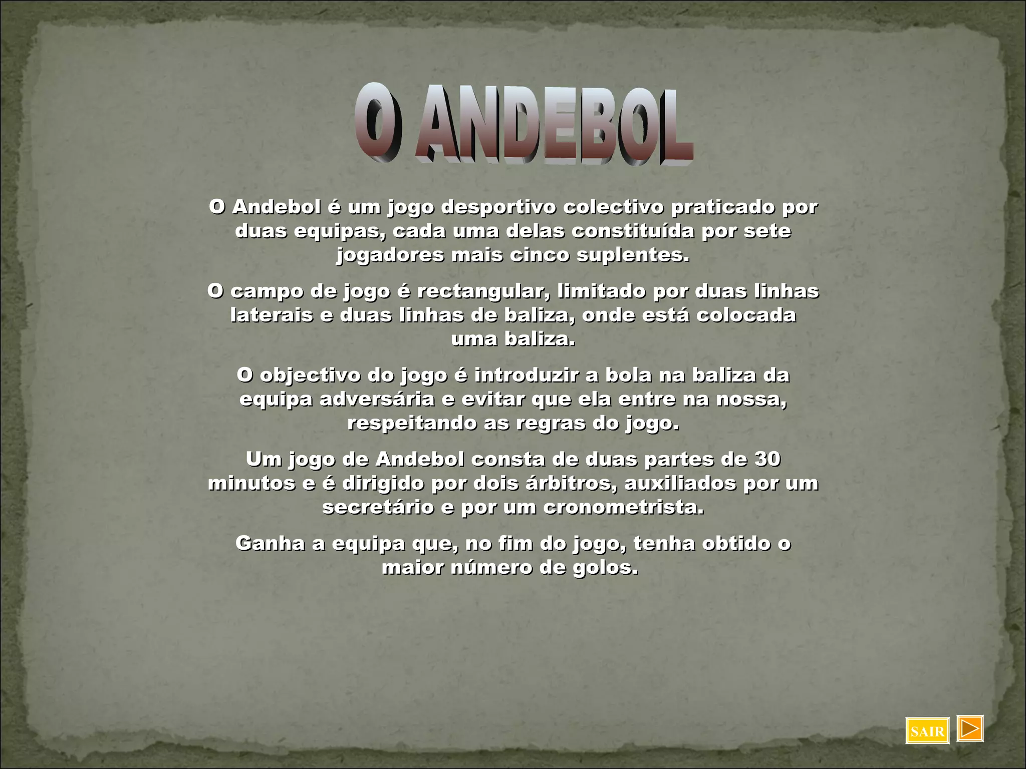 O andebol é um jogo coletivo entre duas equipes de sete jogadores cada que objetiva marcar gols na baliza adversária respeitando as regras. É jogado em um campo retangular com duas balizas e é dirigido por dois árbitros. A equipe vencedora é aquela que marcar mais gols no fim dos dois tempos de 30 minutos cada.