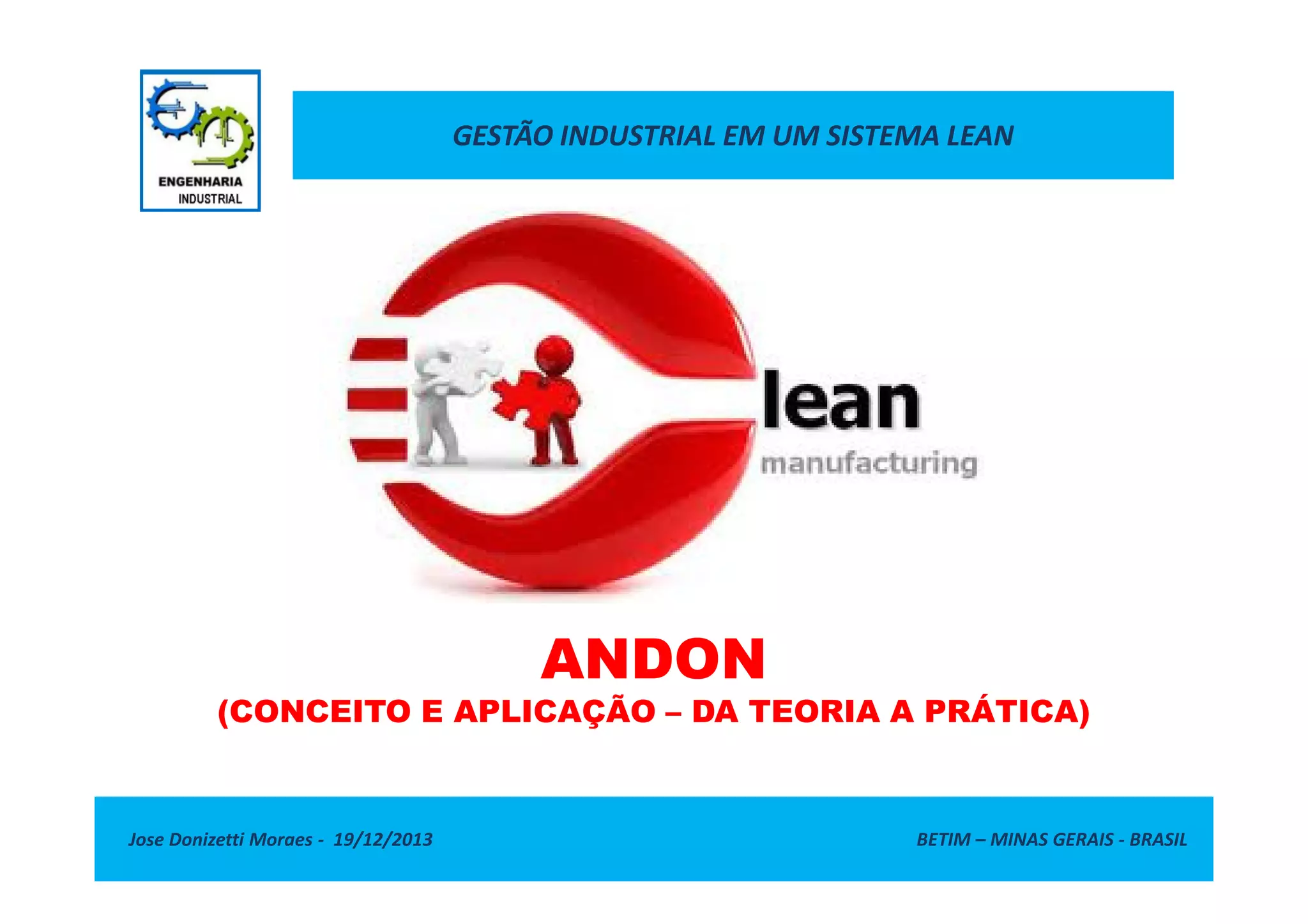 O documento discute o conceito e aplicações práticas do Andon, uma ferramenta visual Lean usada para notificar anormalidades. Ele explica que o Andon ajuda a "parar e notificar" problemas e pode ser usado para gerenciar a manufatura, logística e segurança por meio de sistemas de luzes. Além disso, argumenta que gestores devem prestar mais atenção aos Andons para melhorar a gestão da produção.