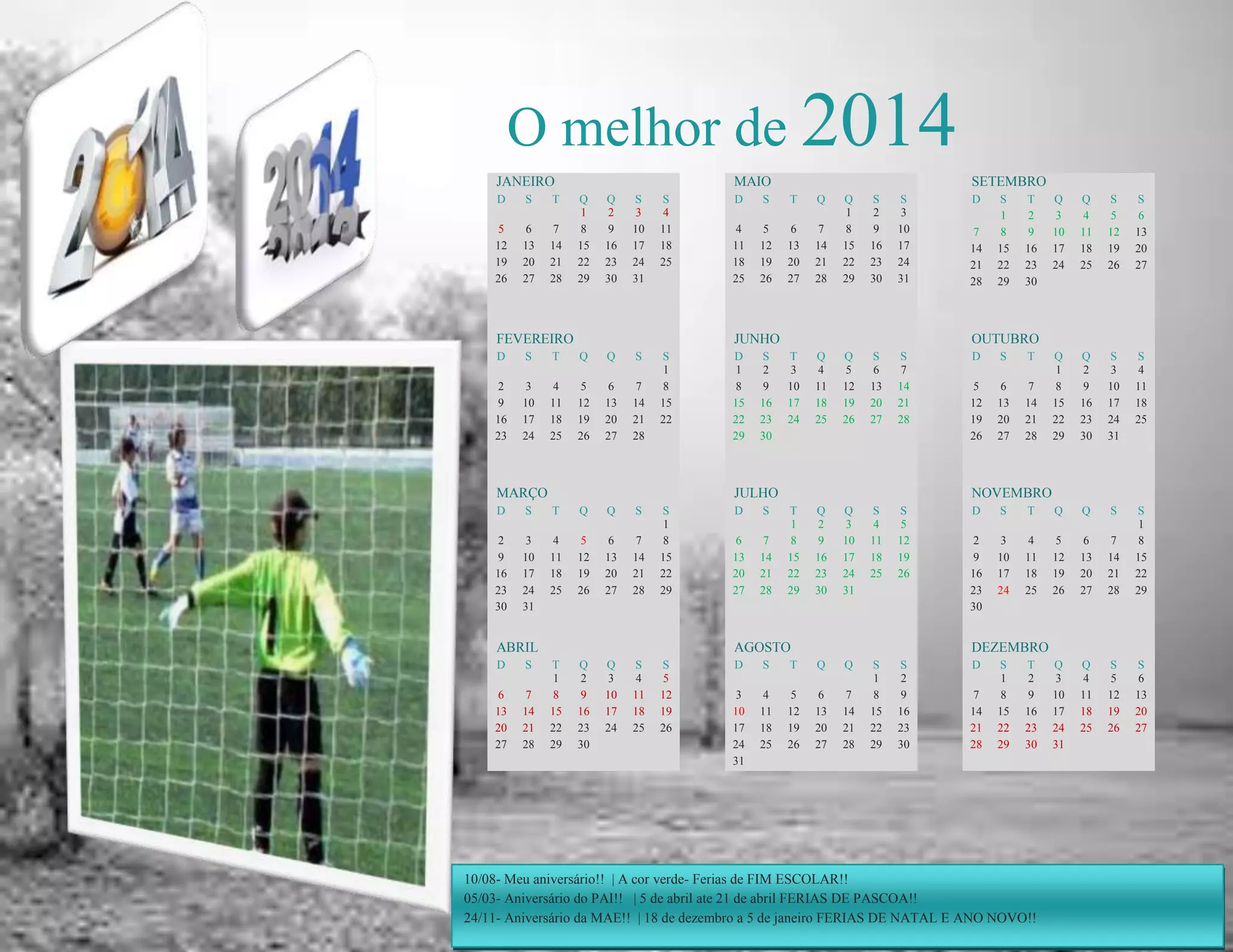 Este documento apresenta um calendário anual com os meses de janeiro a dezembro, destacando três datas importantes: o aniversário do usuário em 10 de agosto, o aniversário do pai em 5 de março e o aniversário da mãe em 24 de novembro. Além disso, indica os períodos de férias escolares da Páscoa, fim de ano letivo e Natal.
