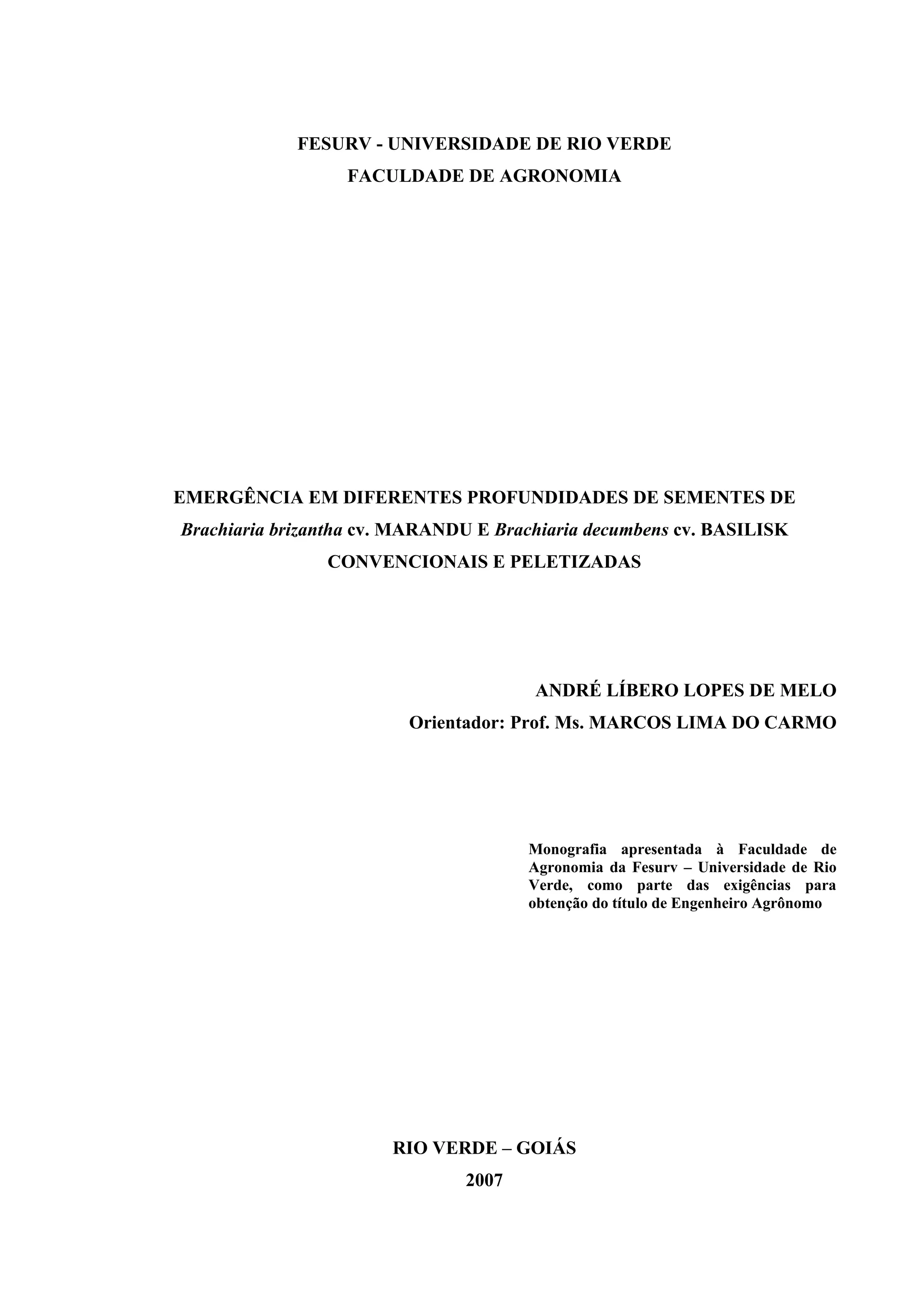Este documento resume um estudo sobre a emergência de sementes de Brachiaria brizantha cv. Marandu e Brachiaria decumbens cv. Basilisk convencionais e peletizadas em diferentes profundidades de semeadura. O estudo avaliou a emergência das gramíneas em vasos em casa de vegetação durante 21 dias em profundidades de 0 a 10 centímetros. Os resultados mostraram que as melhores taxas de emergência para B. brizantha foram entre 1-6 centímetros e para B. decumbens entre 1-4 centímetros. As