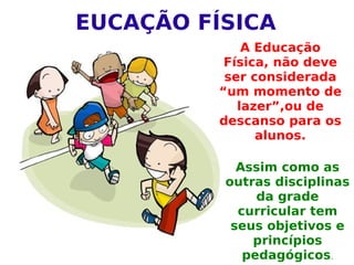 A educação física escolar é uma disciplina pedagógica que promove a cultura corporal e não deve ser vista como apenas um momento de lazer. Tem objetivos como o desenvolvimento cognitivo, autonomia e socialização, além de enfatizar a importância do lúdico na infância. Por meio do brincar, as crianças vivenciam experiências práticas que são fundamentais para seu aprendizado.