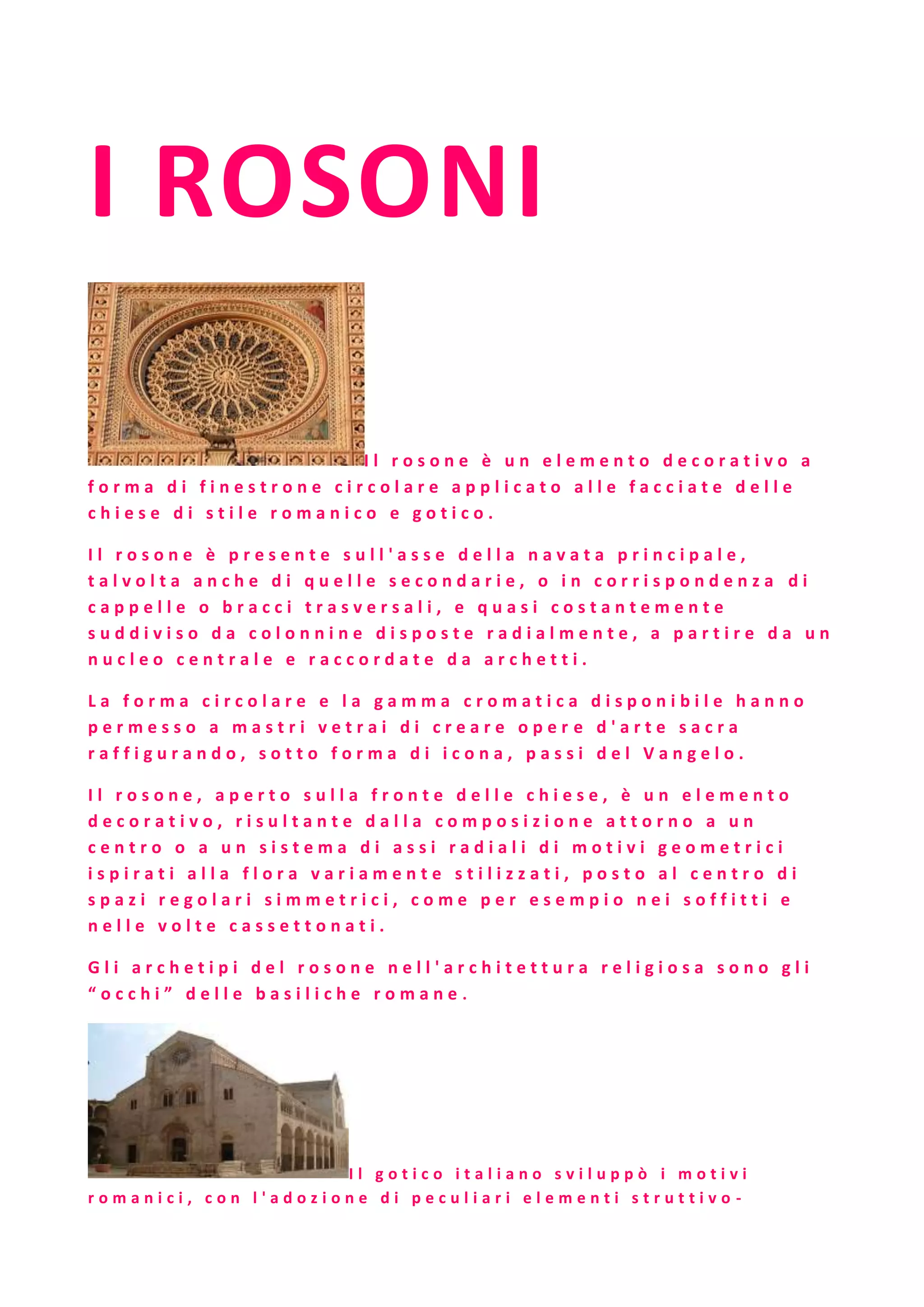 1. I rosone erano elementi decorativi circolari applicati alle facciate delle chiese in stile romanico e gotico. Erano posti sopra le navate e le cappelle e divisi da colonnine disposte radialmente.