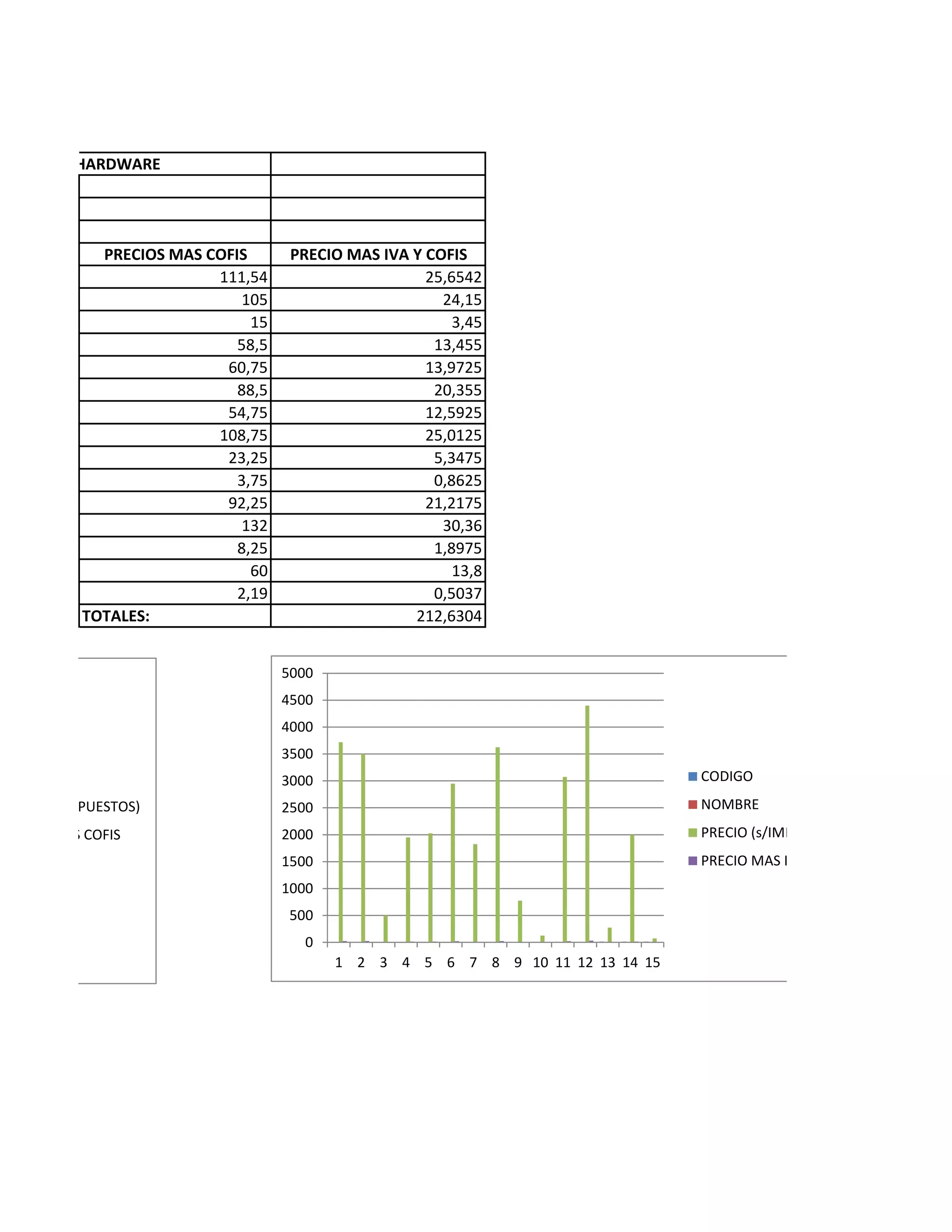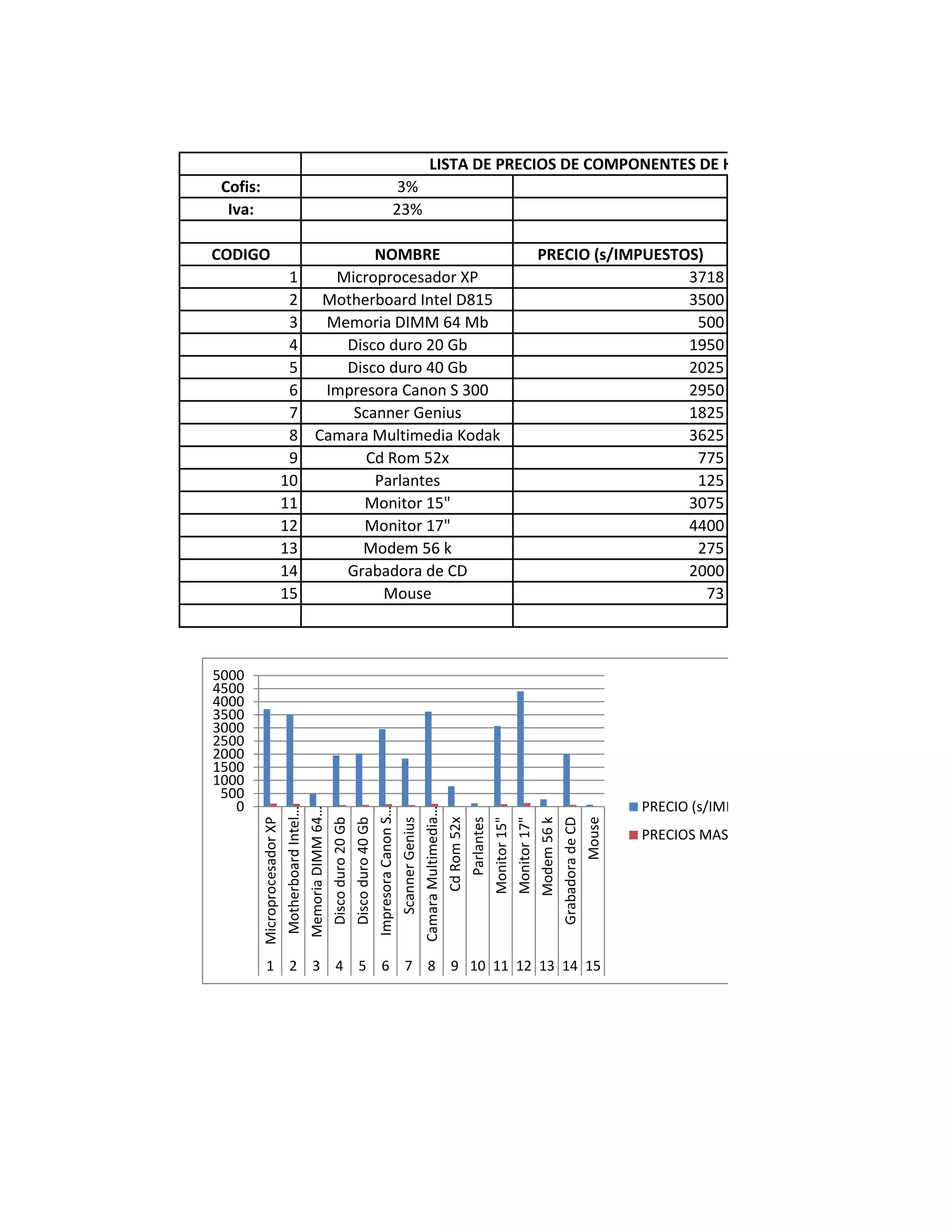 Este documento lista los precios de varios componentes de hardware, incluyendo microprocesadores, memorias, discos duros, impresoras, escáneres y monitores. Se detallan los precios unitarios de cada componente sin impuestos, así como los precios con el 3% de cofis e IVA del 23% aplicados. En total, con impuestos los componentes cuestan 212,6304 unidades monetarias.