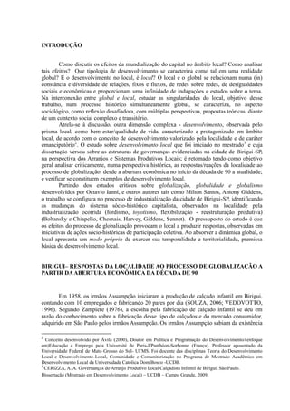 O documento analisa as respostas da cidade de Birigui, São Paulo ao processo de globalização desde a abertura econômica dos anos 1990 no setor calçadista. Começando com poucas empresas na década de 1950, o setor cresceu rapidamente e hoje responde por 10% da produção nacional de calçados. Nos últimos 20 anos, a cidade desenvolveu estratégias como feiras, programas de qualidade e consórcios de exportação para enfrentar a concorrência externa, especialmente da China. O estudo avalia se essas respostas constit