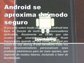 O documento discute vários tópicos relacionados à segurança em sistemas operacionais móveis, incluindo a arquitetura de segurança do Android, hipervisores de tipo 1, multi-boot em dispositivos móveis, e o conceito de webtop. Ele também menciona o crescente mercado de aplicativos Android e como empresas de MDM estão ajudando a fornecer proteção de dados e gerenciamento para usuários corporativos.