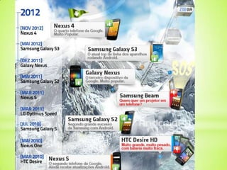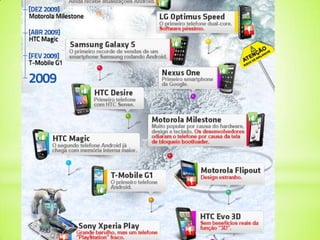 O documento fornece um resumo histórico do Android, desde sua criação em 2003 até versões recentes como o Jelly Bean de 2012. Detalha os principais marcos do sistema operacional móvel, incluindo lançamentos de versões, dispositivos e parcerias. Também aborda brevemente as habilidades necessárias para atuar como desenvolvedor Android e as oportunidades de carreira na área.