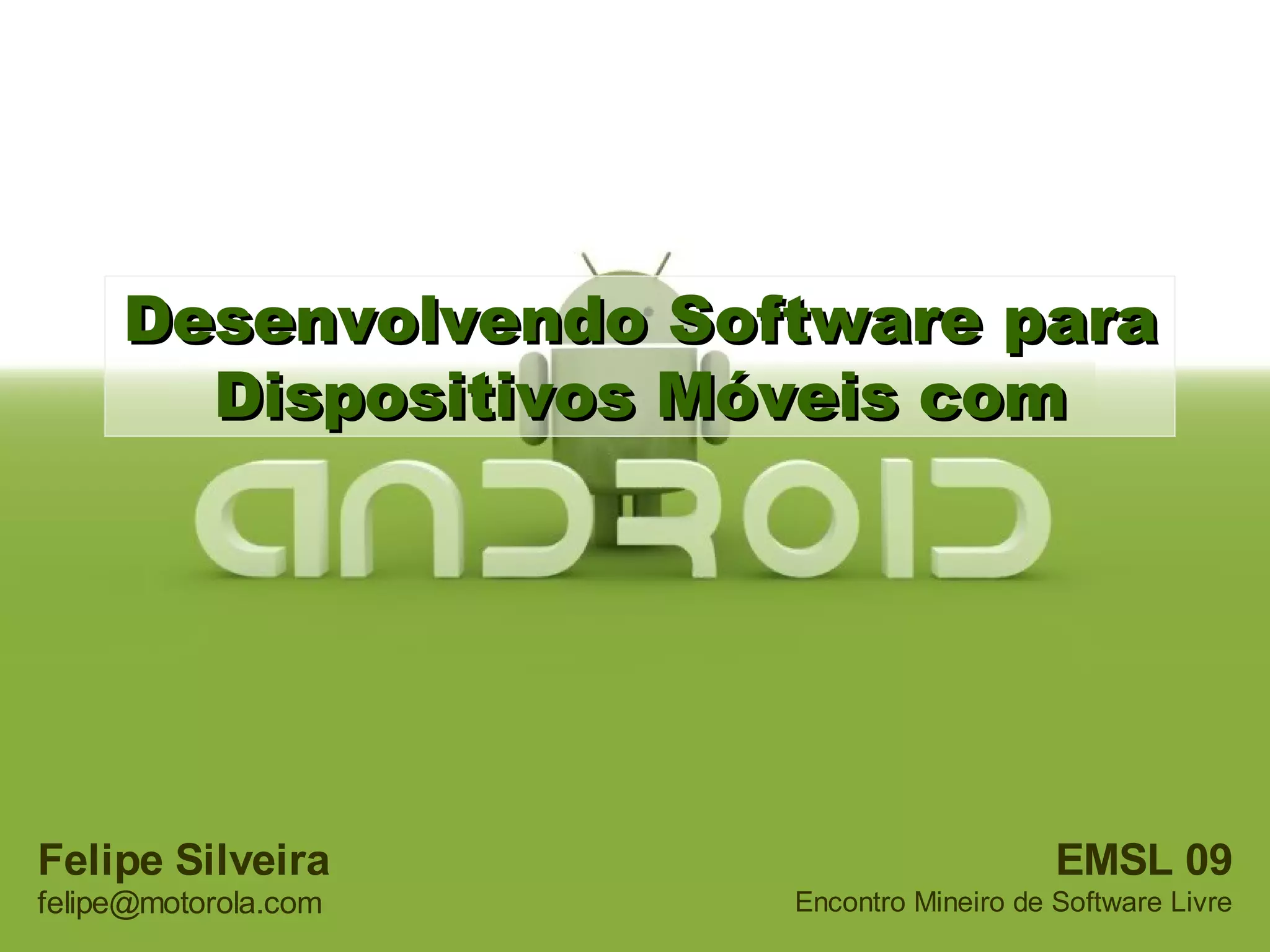 O documento apresenta uma palestra sobre o desenvolvimento de software para dispositivos móveis utilizando a plataforma Android, abordando suas funcionalidades, arquitetura e aplicações. Também discute ferramentas de desenvolvimento, exemplos de código e o mercado de dispositivos Android. Links relevantes para recursos adicionais sobre o Android e a Open Handset Alliance são fornecidos.