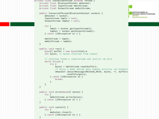 O documento descreve a API Bluetooth do Android, incluindo classes como BluetoothAdapter e BluetoothDevice, permissões como BLUETOOTH e BLUETOOTH_ADMIN, e como implementar funcionalidades como descobrir, conectar e transferir dados entre dispositivos via Bluetooth.