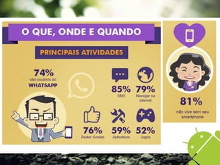 O documento discute o sistema operacional Android, desde sua evolução, mercado móvel atual e oportunidades para desenvolvedores. Apresenta detalhes sobre o que é o Android, suas possibilidades, como iniciar no desenvolvimento mobile e informações sobre um curso Android oferecido.