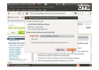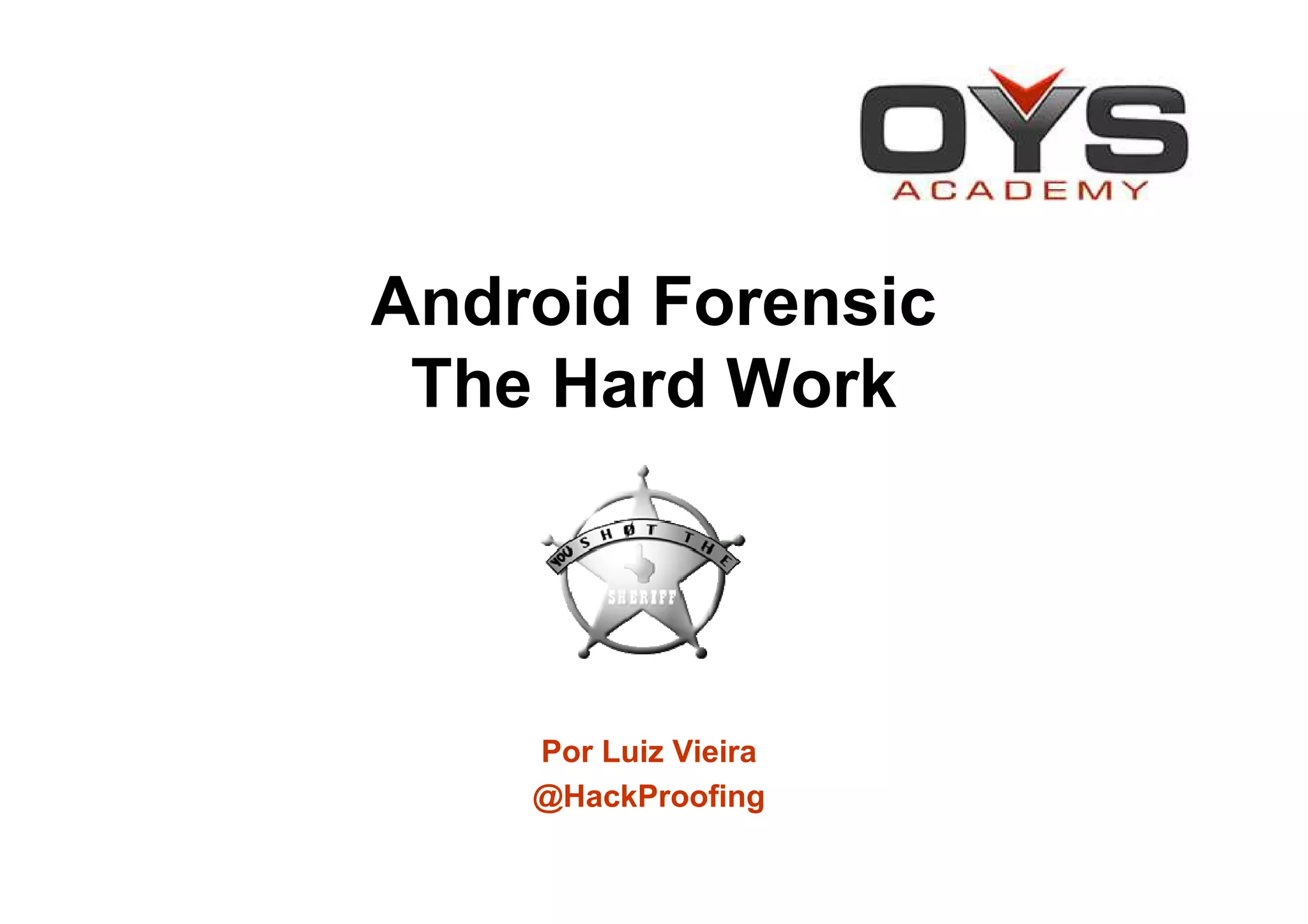 O documento discute técnicas forenses em dispositivos Android, incluindo a identificação do aparelho, aquisição de imagens lógicas e físicas, e localização de dados como contatos, SMS e cache de geolocalização. Ele também apresenta ferramentas como FTK Imager, DD e ADB para aquisição de imagens e acesso root ao dispositivo.