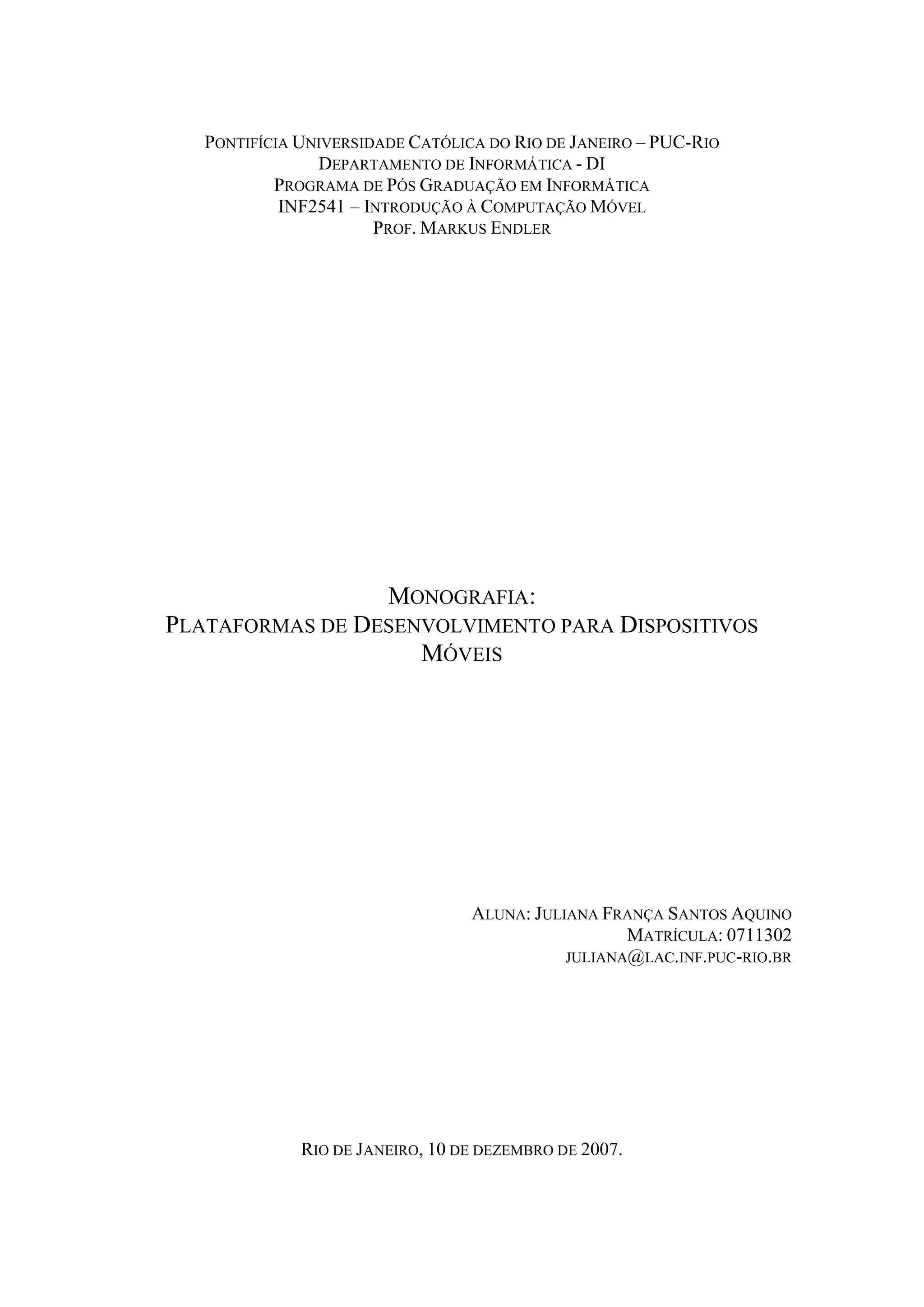 O documento descreve duas plataformas de desenvolvimento para dispositivos móveis: Android e Qtopia. Ele explica a arquitetura e componentes principais do Android, incluindo o kernel Linux, bibliotecas, Dalvik VM, framework de aplicações e blocos de construção como Activity. Também fornece um breve histórico e descrição da arquitetura do Qtopia.