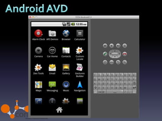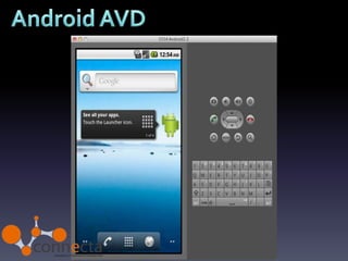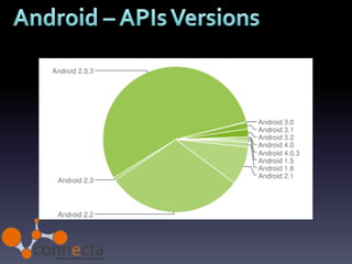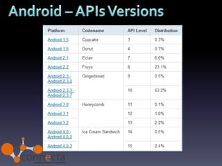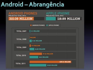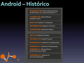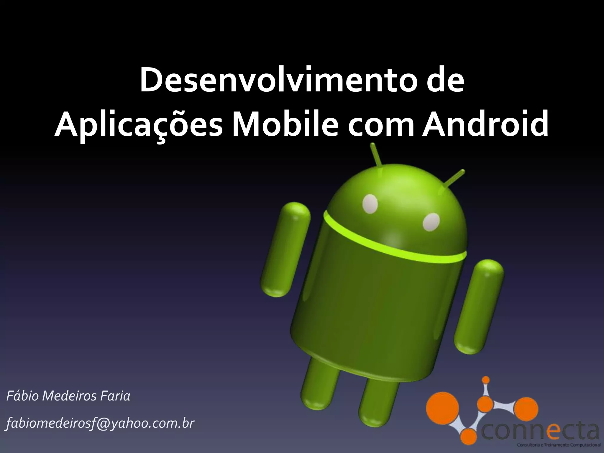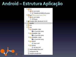 O documento descreve o desenvolvimento de aplicações móveis para Android, incluindo sua história desde a criação pela Android Inc até ser adquirida pela Google em 2005. Detalha também os principais recursos para desenvolvimento como o SDK baseado em Java, ferramentas de desenvolvimento Eclipse, armazenamento de recursos e a loja de aplicativos Google Play.