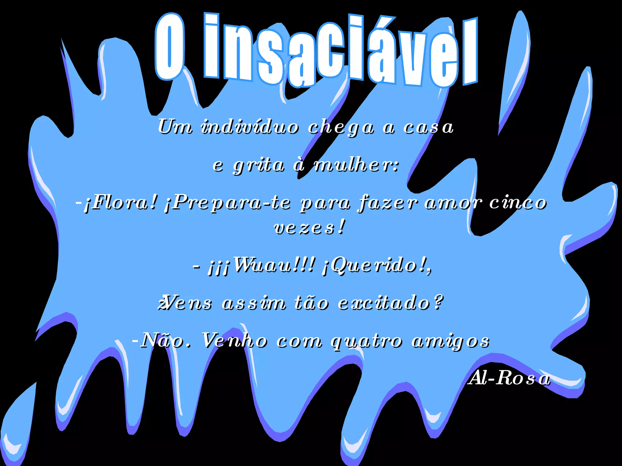 Um indivíduo chegaa casa e grita à mulher: ¡Flora! ¡Prepara-te para fazer amor cinco vezes! - ¡¡¡Wuau!!! ¡Querido!, ¿Vens assim tão excitado? Não. Venho com quatro amigos Al-Rosa O insaciável