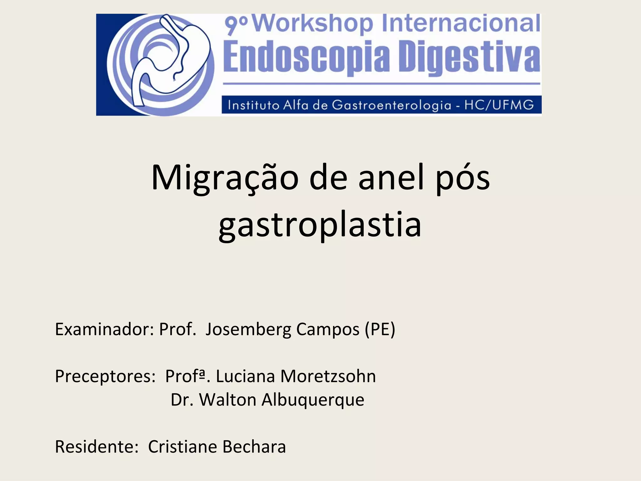 Uma paciente de 39 anos que passou por uma gastroplastia há 5 anos apresentou desconforto abdominal, náuseas e vômitos nos últimos 6 meses. Exame endoscópico revelou migração do anel gástrico para o estômago, o que pode estar causando os sintomas da paciente. Uma abordagem endoscópica é proposta para corrigir a posição do anel.