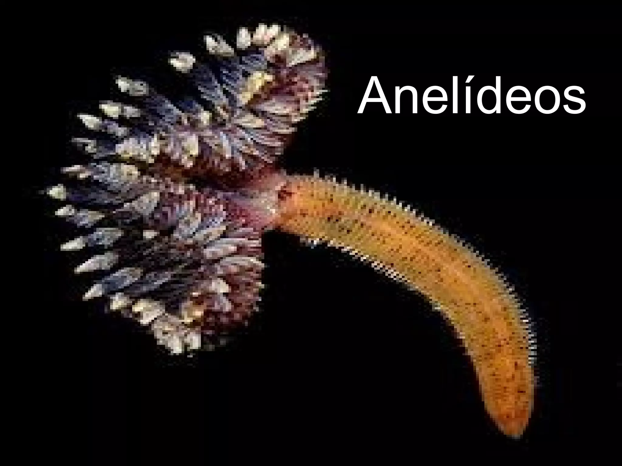 O documento descreve os principais grupos de anelídeos, incluindo suas características, anatomia e reprodução. Os três principais grupos são os oligoquetas, poliquetas e hirudíneos. Os oligoquetas incluem minhocas e têm poucas cerdas, vivem em solo úmido. Os poliquetas vivem no mar e têm numerosas cerdas. Os hirudíneos incluem sanguessugas e não têm cerdas ou patas, se alimentam de sangue.