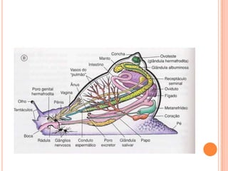 O documento descreve as características gerais dos anelídeos e moluscos. Os anelídeos possuem corpo alongado e segmentado, enquanto os moluscos têm corpo mole e não segmentado, muitas vezes protegido por concha. Ambos são animais aquáticos com sistemas digestivo, nervoso e reprodutivo similares. Exemplos comuns de cada filo são apresentados.