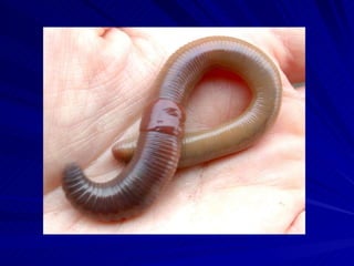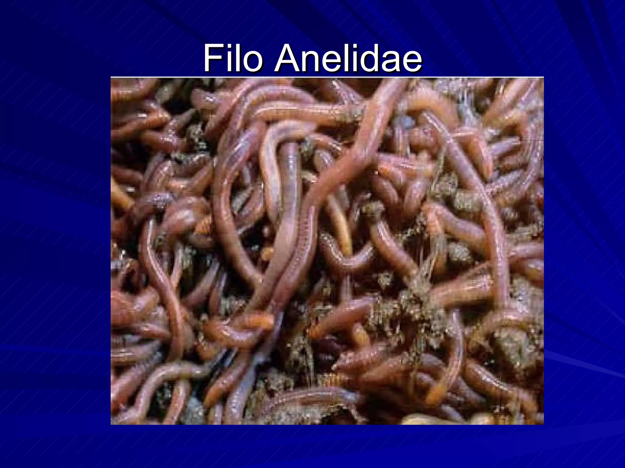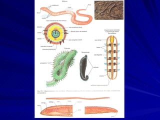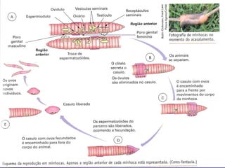 O documento descreve o filo Anelidae, dividido nas classes: Oligochaeta (como minhocas), Polychaeta (com muitas cerdas) e Hirudinae (sanguessugas). O filo apresenta metameria, circulação fechada, excreção por metanefrídios e fecundação externa com desenvolvimento indireto ou direto.